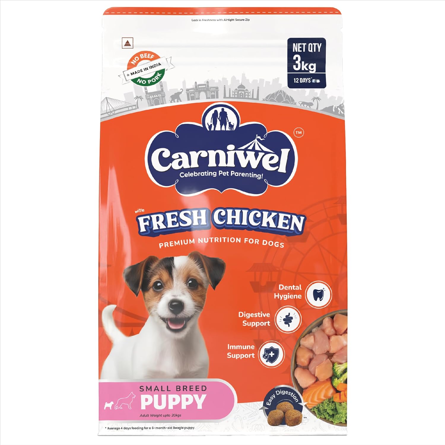 Carniwel Dry Dog Food is specially crafted for small breed puppies. The small-sized kibble aids dental health, making it easier for puppies to chew while promoting healthy teeth and gums. Enriched with Antarctic krill, the formula boosts immunity with antioxidants and essential nutrients. A balanced blend of fresh chicken, fish protein, and L-carnitine supports healthy brain function and muscle development. Carefully selected ingredients, including vegetable fibers, prebiotics, and dehydrated chicken protein, ensure easy digestion and optimal nutrient absorption. Rich in omega-6 fatty acids from vegetable and marine lipids, Carniwel enhances skin and coat health, giving your puppy a shiny, healthy coat. Choose Carniwel for complete nutrition and overall wellness for your small breed puppy.