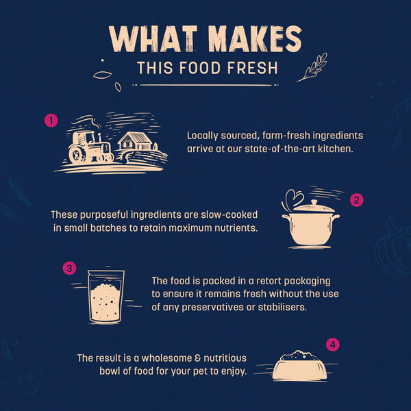 Introducing Sara's Wholesome Food - all natural, ready to eat meals made using fresh, human grade ingredients. This grain free recipe is ideal for dogs with allergies, sensitivities or those who have difficulty digesting grains. Prepared in our state of the art kitchen by canine nutritionists, this meal serves as a balanced diet for dogs of all ages. Every ingredient is purposefully hand-picked and slow-cooked with care to meet your dog's daily nutritional needs.