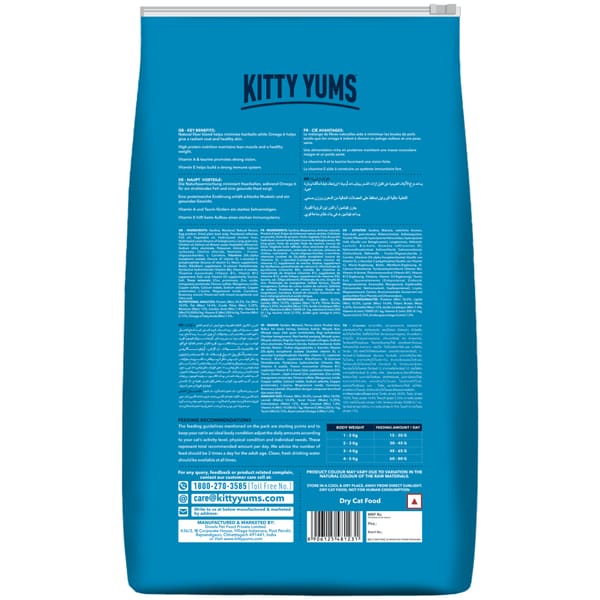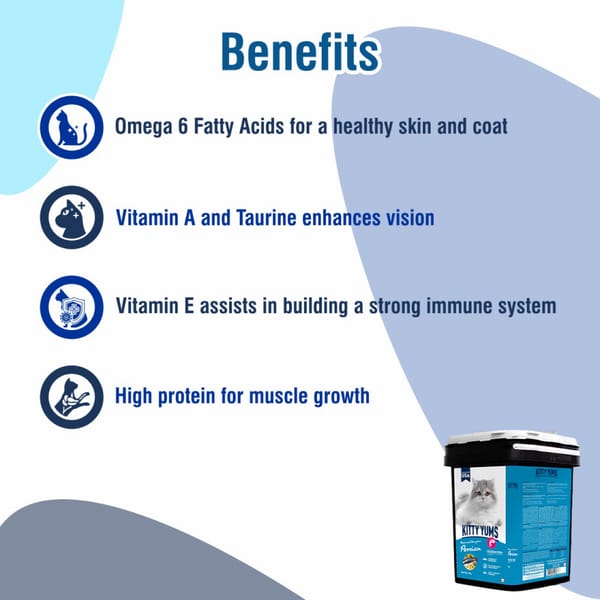 Natural Fiber Blend Helps Minimize Hairballs While Omega 6 Helps Give A Radiant Coat And Healthy Skin. High Protein Nutrition Maintains Lean Muscle And A Healthy Weight Vitamin A & Taurine Promotes Strong Vision Vitamin E Helps Build A Strong Immune System. Kitty Yums Is Formulated In USA.
