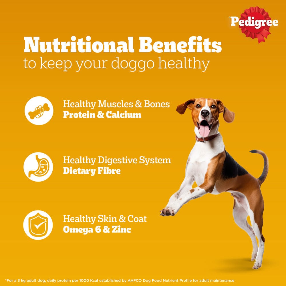 Make every mealtime a fusion of taste and nutrition for your Dog with Pedigree. Made with real meat and high quality protein, Pedigree Adult Wet Dog Food, Chicken & Liver Chunks in Gravy, ensures that you are providing a meal that keeps your dog happy and supports their well-being. This exciting meal is packed with gravylicious chicken & liver chunks that your furry companion will love. Packed with essential nutrients, it is a 100% complete and balanced meal that provides your dog with all the nutrients to stay healthy and strong. Protein & Calcium support healthy muscles & bones while Dietary Fibre supports a healthy digestive system. Omega 6 and Zinc help keep your dog’s skin and coat healthy. The water content in the meal ensures your dog is well-hydrated. At Pedigree, recipes are developed based on research from the Waltham Centre for Pet Nutrition. Every product from Pedigree meets the requirements laid down by NRC 2006 of the U.S. National Academy of Science. Give your dog the goodness of Pedigree to satisfy their cravings and support their good health.