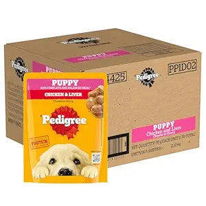 Make every mealtime a fusion of taste and nutrition for your Puppy with Pedigree. Made with real meat and high-quality protein, Pedigree Puppy Wet Dog Food, Chicken & Liver Chunks in Gravy, ensures that you are providing a meal that keeps your puppy happy and supports their well-being. This exciting meal is packed with gravylicious chicken & liver chunks that your furry companion will love. Packed with essential nutrients, it is a 100% complete and balanced meal that provides your puppy with all the nutrients to grow up healthy and strong. Protein & Calcium support strong muscles & bones while DHA supports brain & vision development. Vitamin E & Selenium support a healthy natural defense. The water content in the meal ensures your dog is well-hydrated. At Pedigree, recipes are developed based on research from the Waltham Centre for Pet Nutrition. Every product from Pedigree meets the requirements laid down by NRC 2006 of the U.S. National Academy of Science. Give your dog the goodness of Pedigree to satisfy their cravings and support their good health.ย