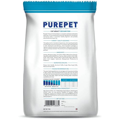 Purepet Ocean Fish Adult Cat Food is a carefully formulated cat food designed to provide essential nutrition for overall wellness in your feline friend. Here are the key features and nutritional information of this cat food: